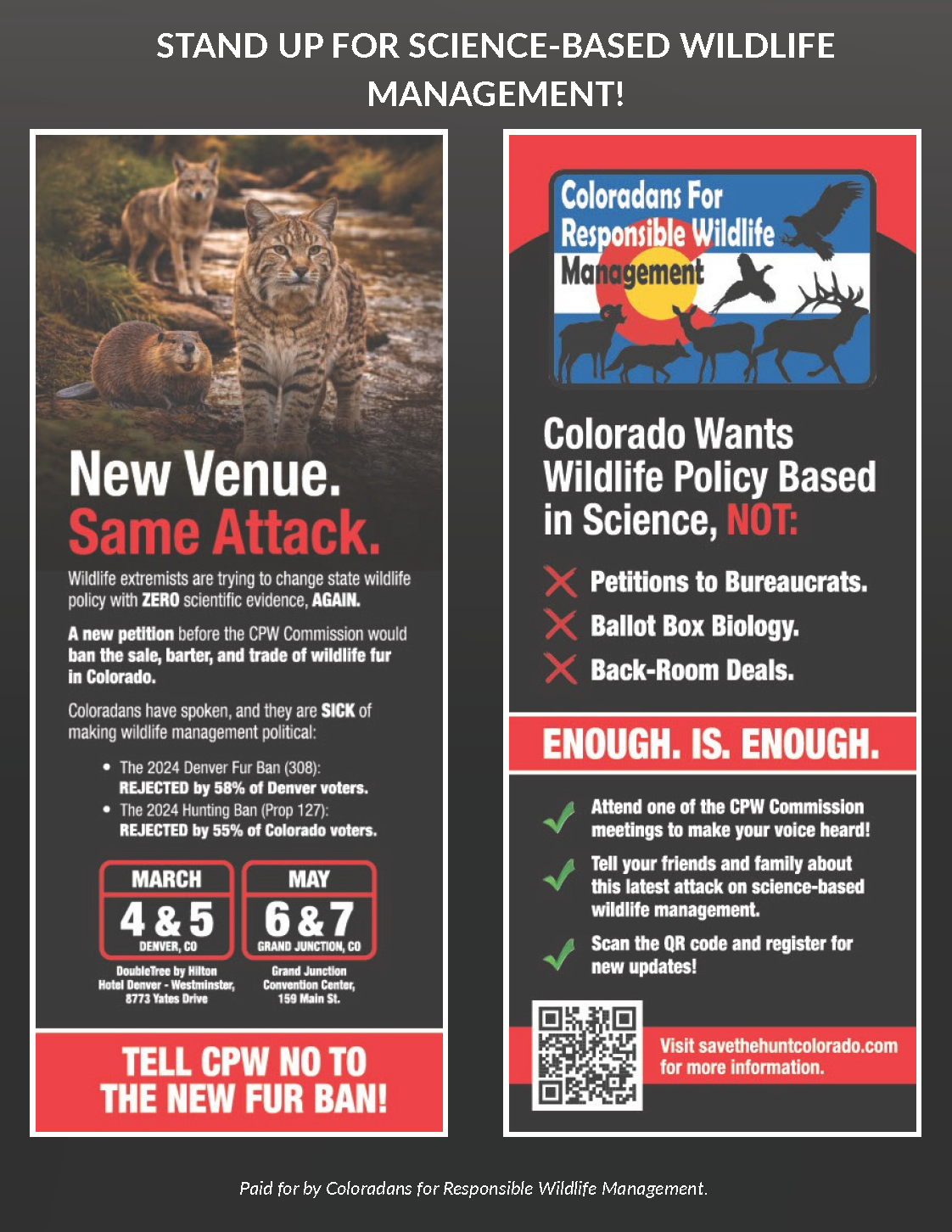 A new petition is headed to the Colorado Parks and Wildlife Commission that would ban the sale, barter, and trade of legally obtained wildlife fur in Colorado. This is another attempt to change wildlife policy without scientific evidence, bypassing the experts who are supposed to manage wildlife using data and the public trust model.