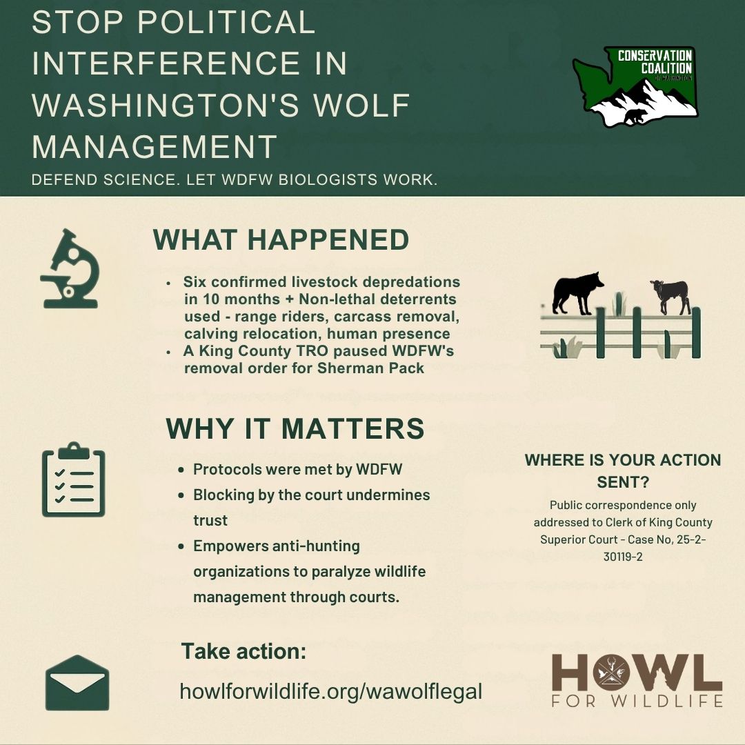 The ask: lift the injunction so WDFW can follow its science-based plan and reduce conflict for both wolves and rural communities. WDFW